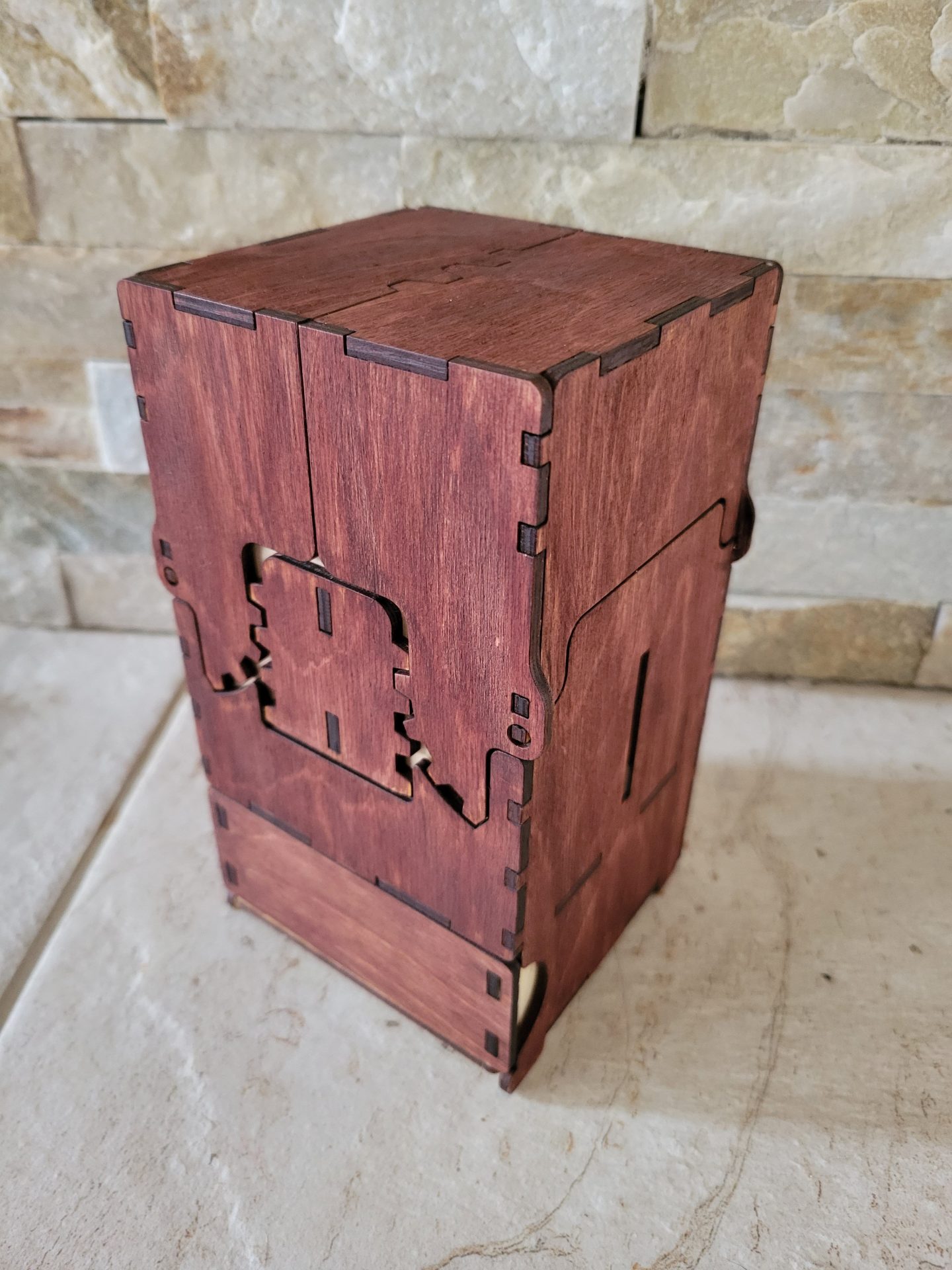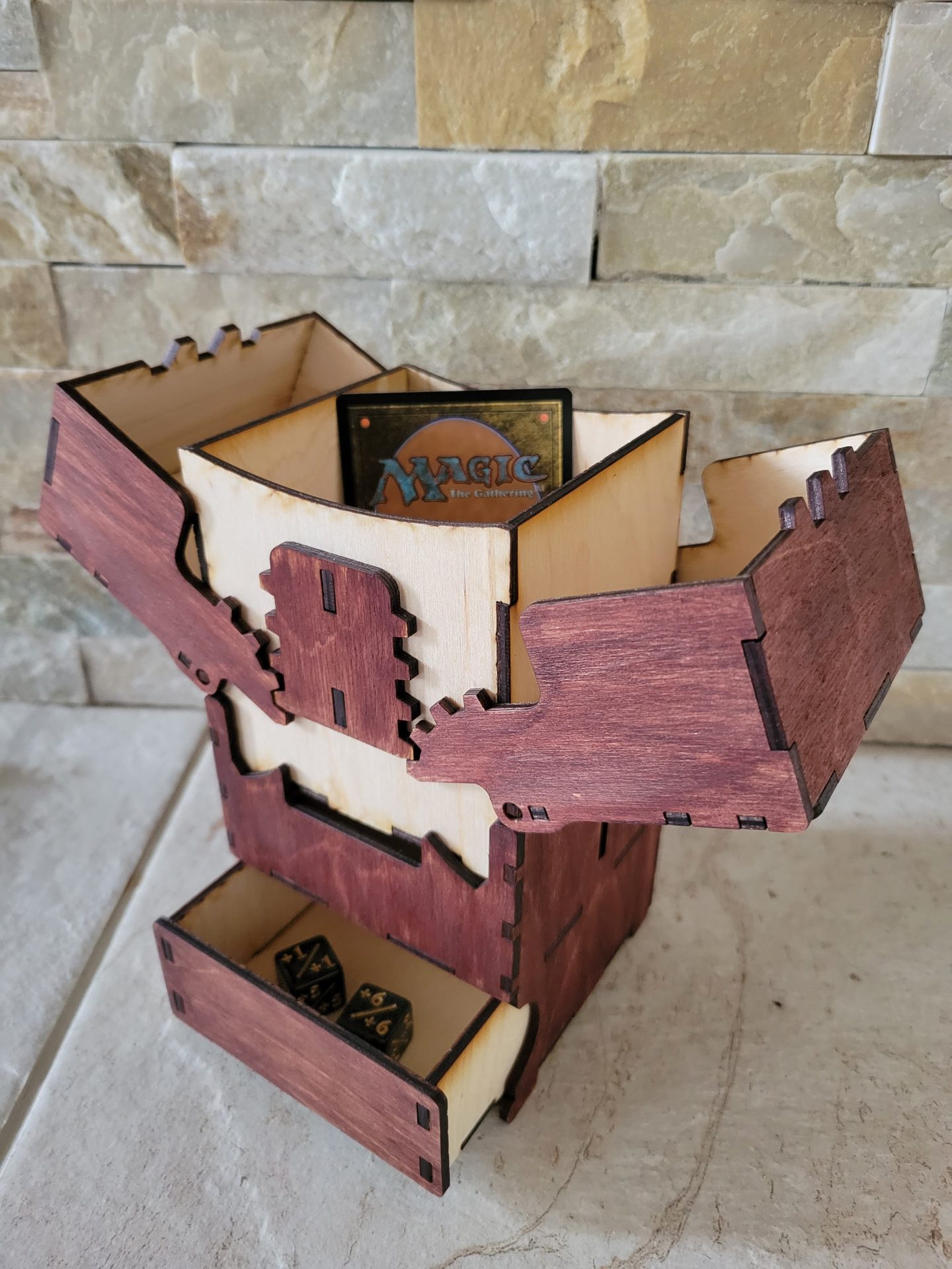 The latest project from the laser printer is a box custom built for a “Magic: The Gathering” card deck and associated dice/ counters. Boxes are sized to accommodate a 100-card Commander deck in sleeves.