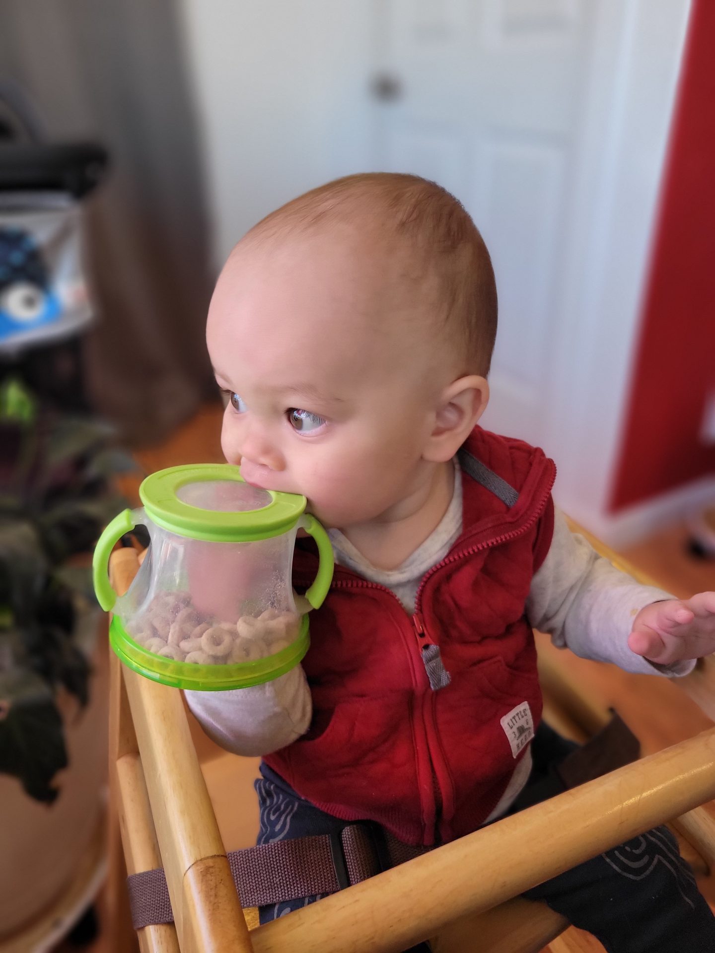I don’t think Cato has quite figured out the design intent of this device yet…he has a fist full of Cherrios but is having a hard time getting them into his mouth