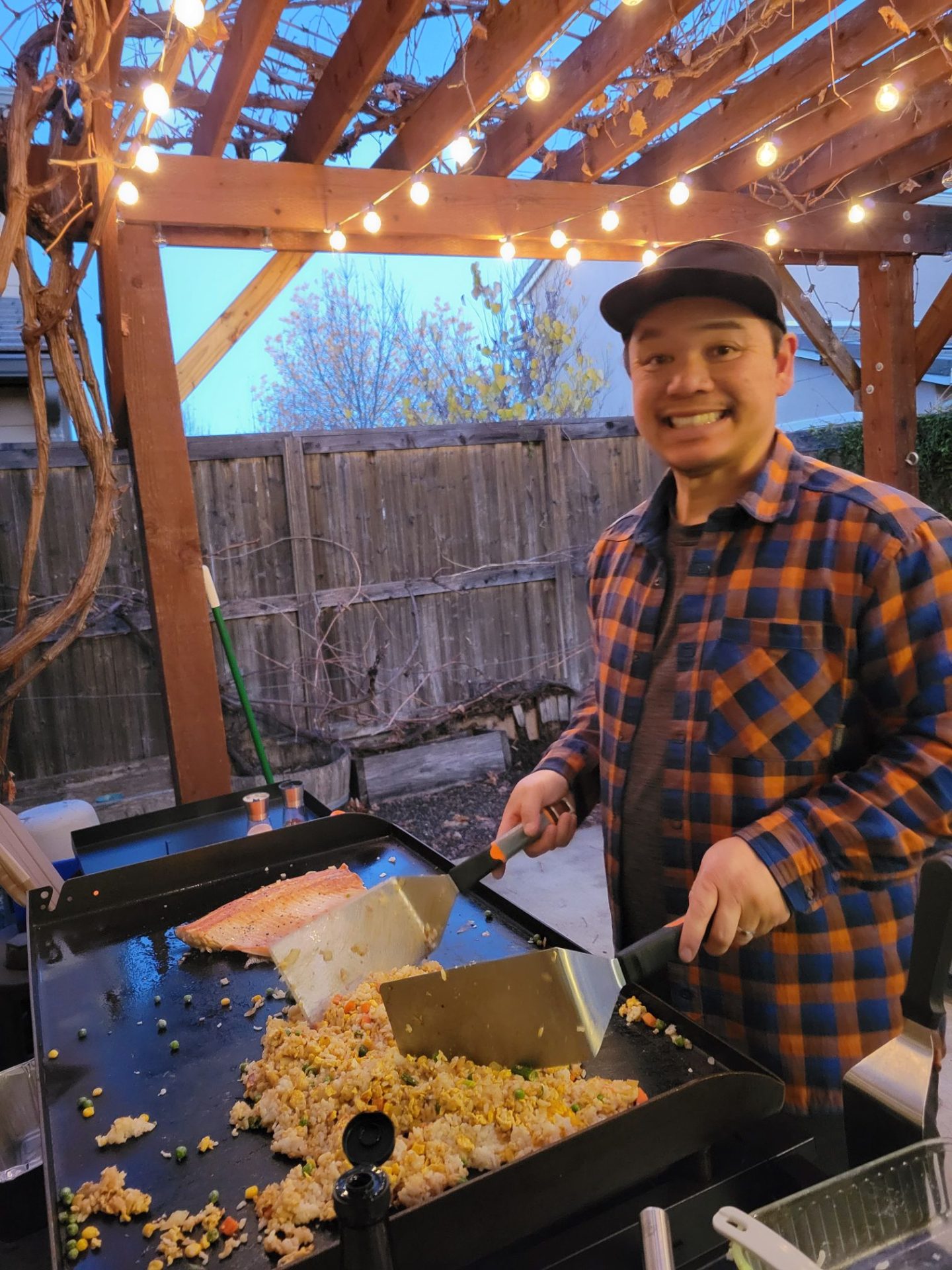 Chief Du cooking on the grill for the first time in the new diggs… Salmon fried rice deliciousness
